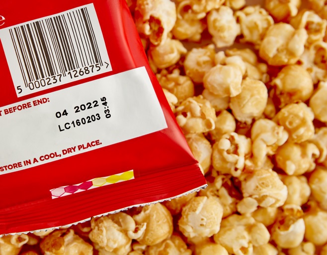 Flexible film and foil packaging coding Printing capabilities of Markem-Imaje Thermal Transfer Overprinter (TTO) coders Understanding Thermal Transfer Overprinting (TTO) While other coding methods have multiple uses, TTO is a digital printing technology that has been developed specifically to be used with flexible materials, making it ideally suited for this process. Thermal Transfer Overprinting is a contact coding process which transfers ink from a ribbon to the material, using a thermal printhead. Thermal transfer technology combines a thermal printhead and a polyester ribbon coated with ink on one side. Ink is transferred from a ribbon to the packaging material using a thermal printhead. This is made up of a row of independent tiny heating elements, mounted on a ceramic support. The different heating elements are activated based on the characters to be printed, melting the ink on the ribbon and transferring the selected characters to the packaging film. The printhead and the ribbon move with the material during this process. There are two types of thermal transfer coders depending on the application Intermittent mode In an intermittent mode the packaging film advances and then stops, such as on a Vertical Form Fill and Seal (VFFS) machine, labeller or tray sealer. The printhead lowers, moves along the packaging film and ribbon. The printhead prints. The printhead is raised, and returns to the home position, the ribbon advances and the process is repeated. Continuous mode In a continuous mode the packaging film is constantly moving such as on a Horizontal Form Fill and Seal (HFFS) machine. When triggered, the ribbon accelerates to the film speed, the printhead is lowered and printing begins. At the end of printing the printhead is raised to the home position and the ribbon stops moving. With a typical output of 300 dpi, TTO offers very high print quality that blends in with the overall design of the pre-printed film. In addition to printing variable information such as best-before dates, barcodes and promotional information, it can also help reduce pre-printed stock by printing static information, such as the product name. |